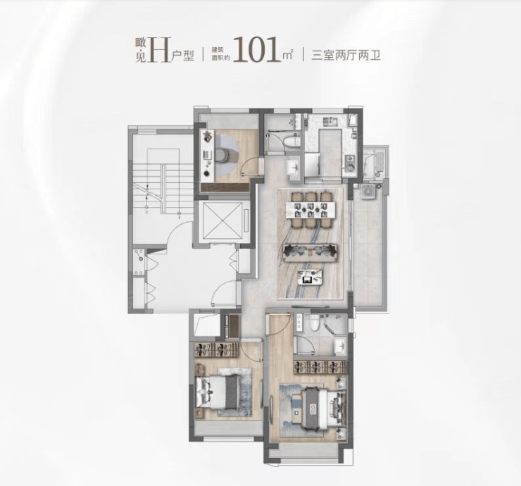建面约101㎡的F和G户型都是市面上备受认可的飞机经典款户型。