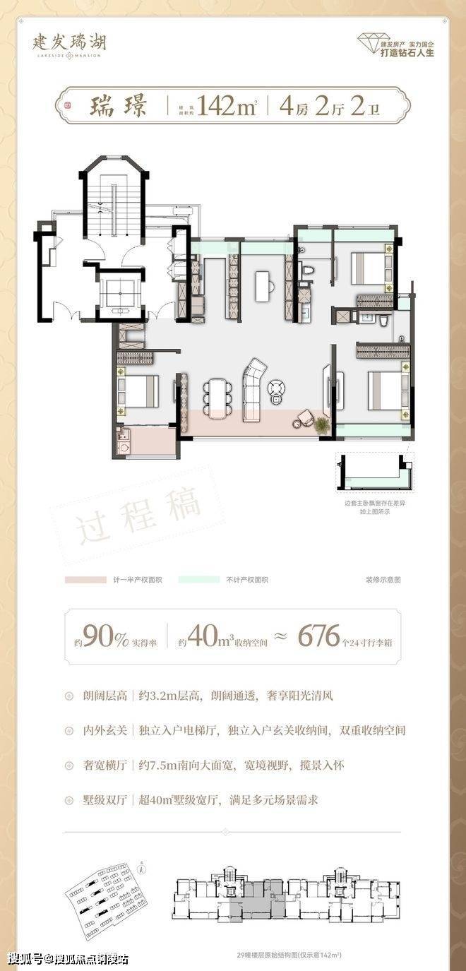建筑面积约142㎡墅级洋房,打造私属入户电梯厅+独立玄关收纳间,提升归家仪式感,更形成内外双重归家收纳体系。全屋收纳空间达到约40m³,相当于约676个24寸行李箱的容量。家的整洁,从入门开始便有章可循。