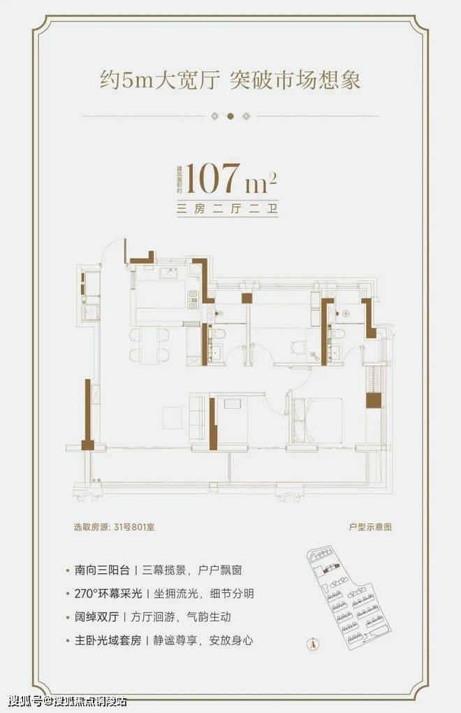 约107m²户型,赠送面积约15m²,实得率约96%,于紧凑面积中,实现罕见奢阔。完全可以满足三口之家或三代同堂年轻家庭居住!约5.0米南向大宽厅,连接约16㎡景观阳台,构成开阔的LDK一体化空间。