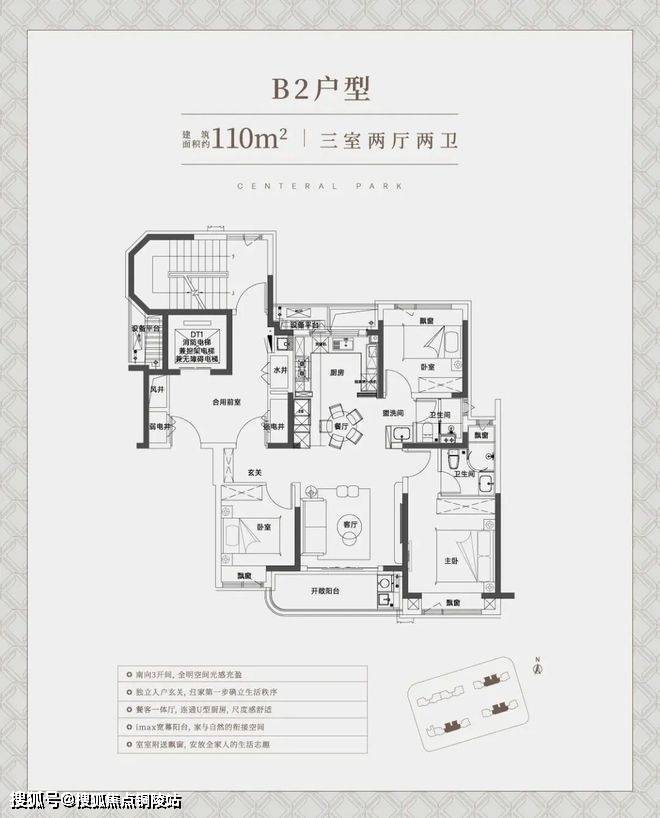 建面约110㎡中间套(B2户型),也同样做到了南北通透,三开间朝南,洄游动线,布局合理,无论是空间尺度还是通风采光,与边套享受一样的品质感!