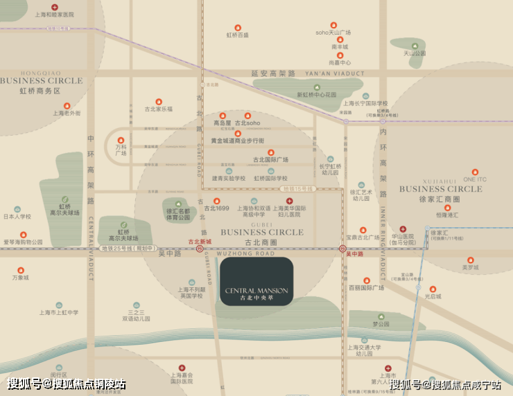 轨交方面:是准双轨交的地铁房,现有的是直线距离约700米的最美地铁站之一的15号线吴中路站,未来还会有25号线的古北新城站,站点位置就设在「古北中央萃」西侧不远处。