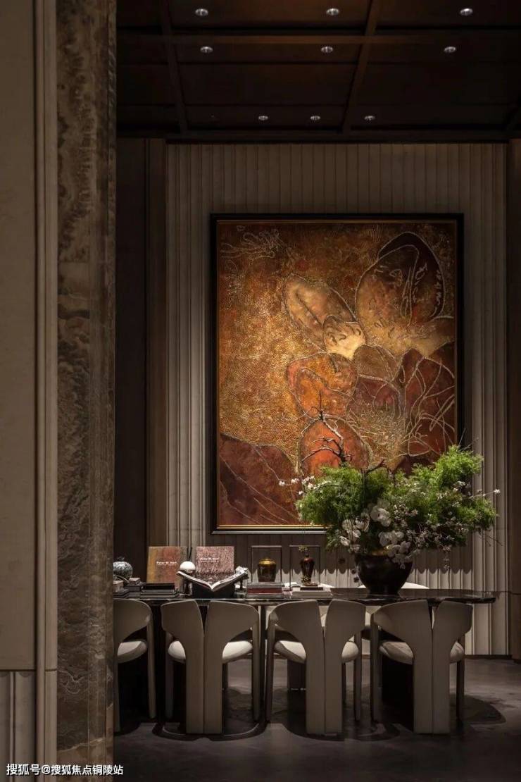 王府规制的通高大门,镶嵌昂贵天然水墨玉,自然天成的“山水画”,传递“玉出东方,门纳乾坤”的美好寓意;会客区域非遗艺术家画作《繁花映春》,耗时3月而成,诠释历久弥新的艺术价值。