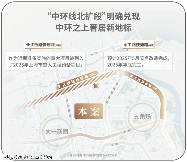 作为上海市重大工程,「中环北抬」通过军工路、长江西路、沪太路三条快速路互联,重构浦西北交通骨架。这项工程不仅延伸中环线,更通过立体路网打造串联宝山、杨浦、静安的「城市交通脊梁」,竣工后将形成复合功能交通带,推动沿线板块价值升级。