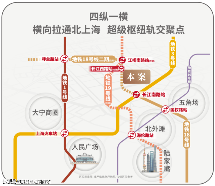项目紧邻长江西路地铁站(在建),直线距离仅200米(北门至地铁站)地铁18号线横向拉通了原本纵向不相连的四线地铁(1/3/18/19),将北上海横向联通,成为区域轨交的交汇聚点。1站江杨南路,5站复旦,7站五角场,让您快速抵达城市的各个核心区域,畅享便捷的都市生活。