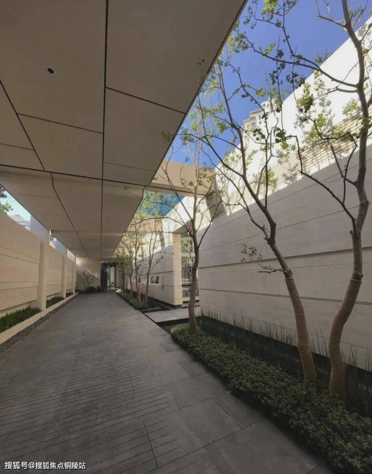 造景的用料也同样考究,大门景墙选用工艺复杂、用料扎实的沙漠风与白海棠石,风雨连廊选用了经过多轮艺术工艺抛光打磨形成的哑光荔枝面的沙漠风石。