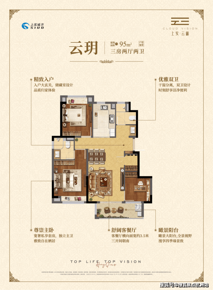 【上实云端售楼处电话】:400-8877-480 (预约看房热线)约95㎡三房两厅两卫,做到了三开间朝南+瞰景大阳台+主卧套房设计+南北通透+卫生间干湿分离,该户型得房率和空间利用率都非常高.