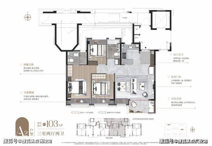 项目建面约103㎡3房同样是三开间+大横厅的布局,但尺度上更进一步。而且灵动空间更多,全屋飘窗+南向观景阳台,提升性价比的同时也增强户型对外的延展性。