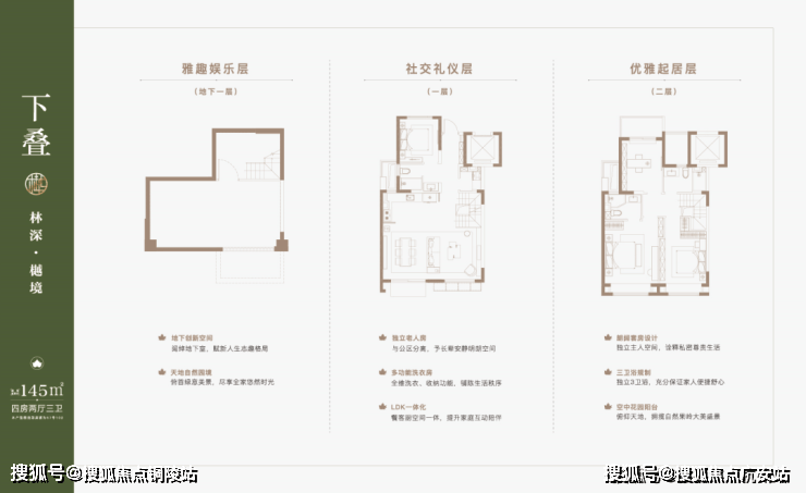 以145㎡下叠为例,四房两厅三卫全能格局,非常适合二娃家庭以及三代同堂。