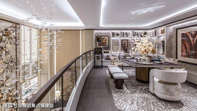 近10米挑高的双层书吧,用一整面巨幕玻璃将水院的景色框进室内,让这里不止是阅读的场所,更成为业主安放身心的精神高地。
