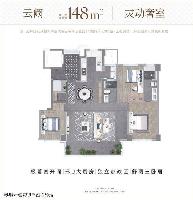 作为项目主力改善户型,建面约148㎡4房深度适配住宅新规,以3米+层高突破传统空间局限,搭配多飘窗、多阳台布局,让空间利用率得到显著提升。