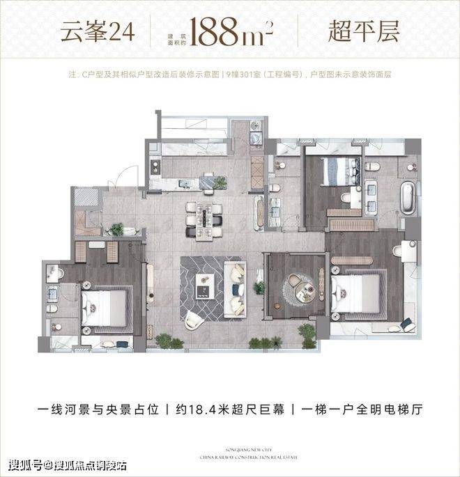 户型以约18.4米南向五开间设计,实现了全屋充足的采光与无遮挡观景视野;