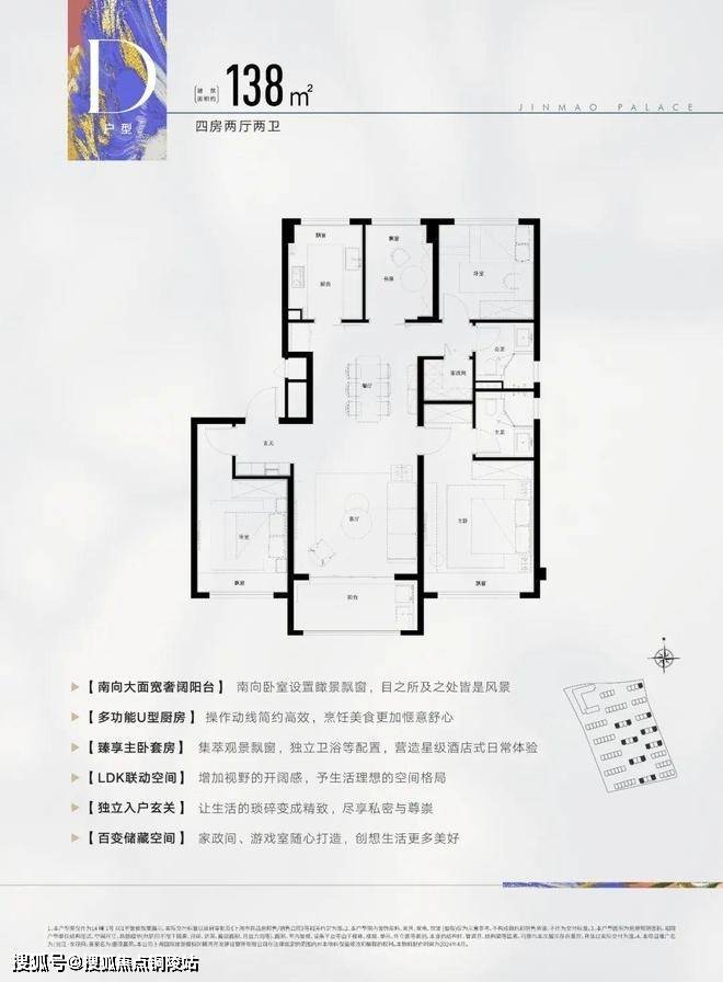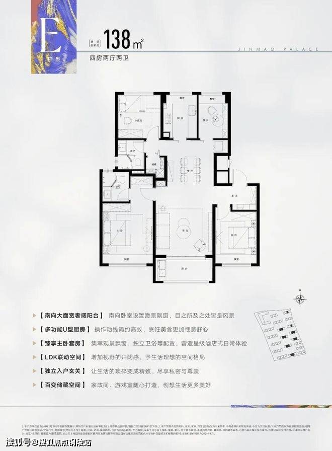 此户型为飞机户型,可以说是改善人群非常喜欢的户型,建面约138㎡4房2厅2卫设计,动静分区,三开间朝南,各空间尺度奢阔,还有一个大面宽景观阳台,实现功能性和舒适度兼得。