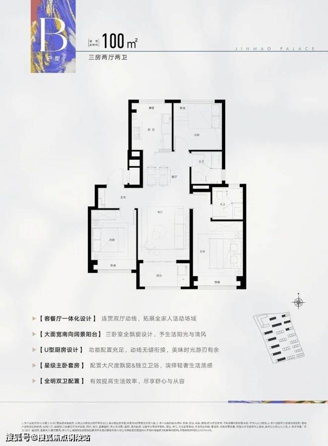 建面约100㎡3房2厅2卫户型