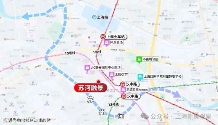 苏河融景整个小区由汉中路、长安路、普济路与恒丰路围合,临近汉中路地铁站和苏州河滨河景观带。苏河融景整个小区分2期开发,其中1号2号一期开发,其余楼栋二期开发。