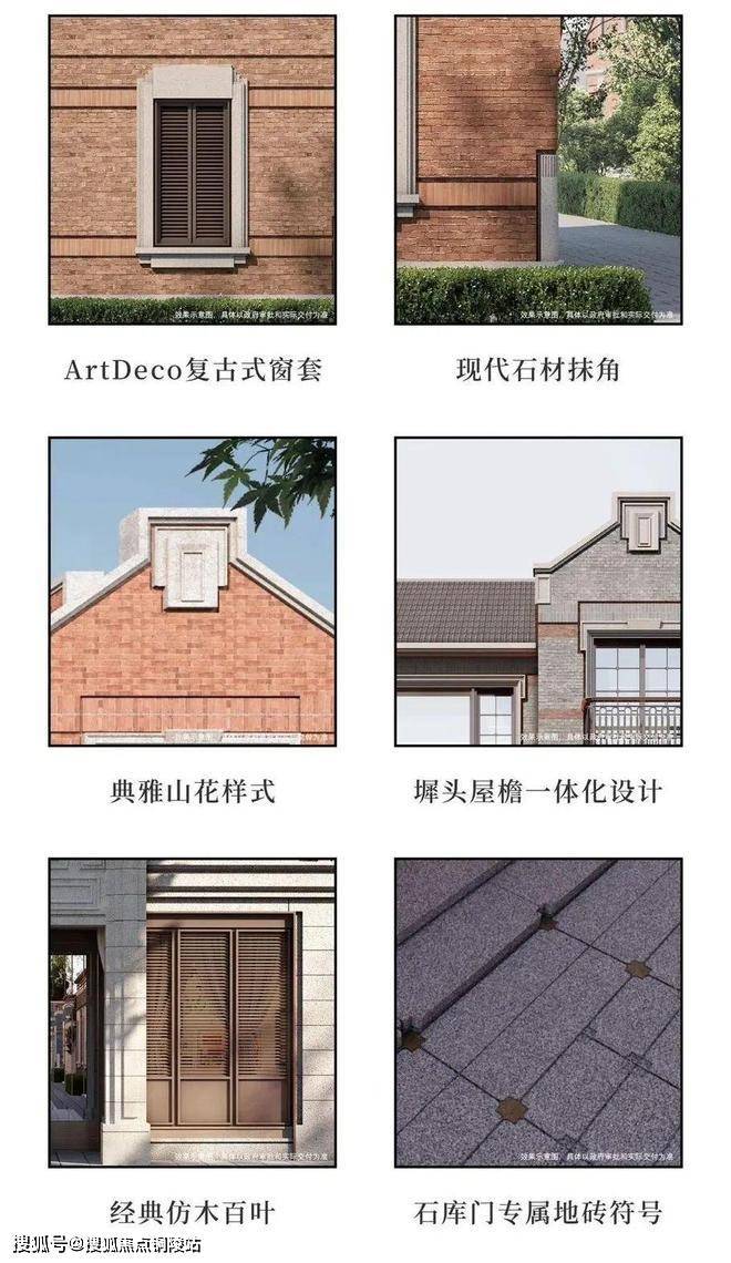 深入看细节,你会发现项目高颜值的6大新复古元素。包括Artdeco复古式窗套、现代石材抹角、典雅山花样式、墀头屋檐一体化设计、经典仿木百叶、石库门专属地砖符号等,用先锋表达回应在地文化。