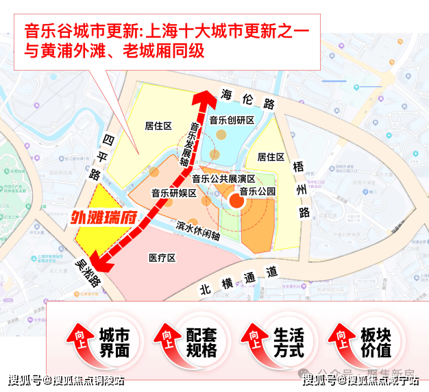 旁边还有上海首批十大城市更新单元——虹口嘉兴01单元。这个单元是内环少有的“完整水系风貌更新区”,未来将依托虹口港打造“一湾两半岛”,定位“东方百老汇”:滨水步行道连贯成片,百年石库门里弄变身爵士乐演出场地与独立艺术画廊,滨水市集的霓虹与水岸光影交织,形成“生活为体,音乐为魂”的海派艺文场景。这种“历史+生态+艺文”的高级烟火气,是传统豪宅区没有的,住这儿不是“看风景”,而是把生活过成“未来艺术化剧场”。