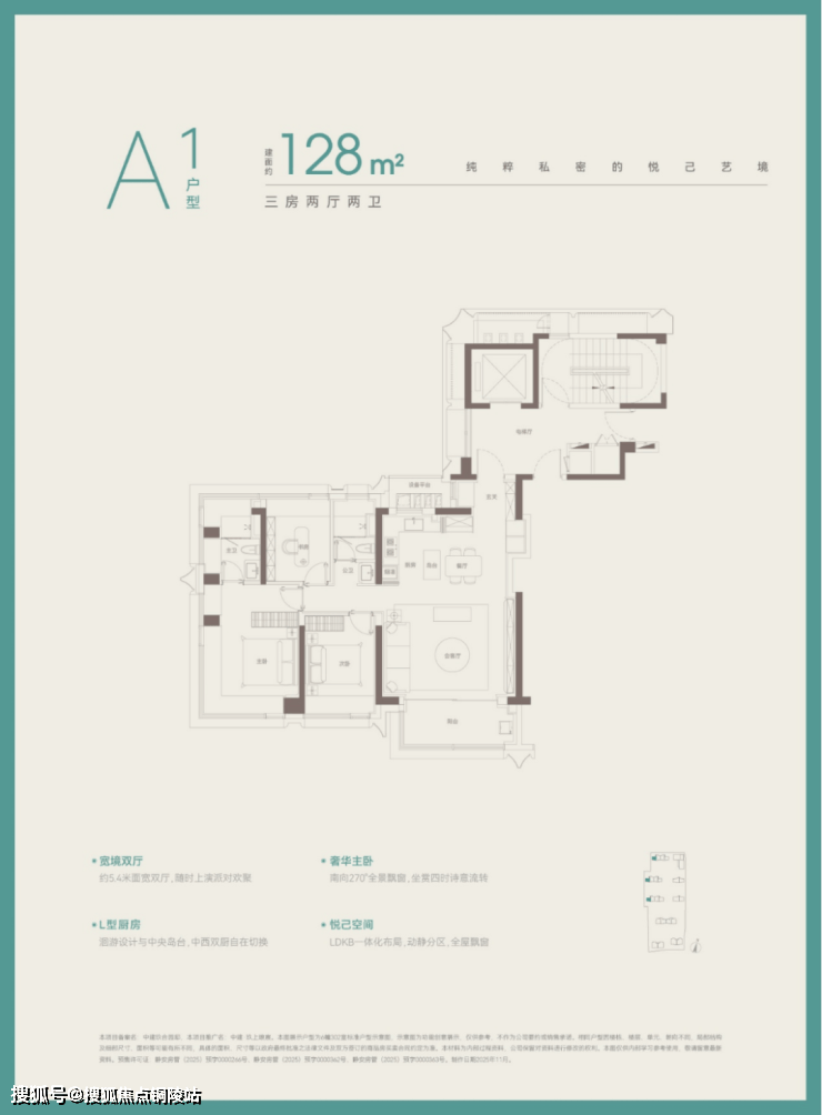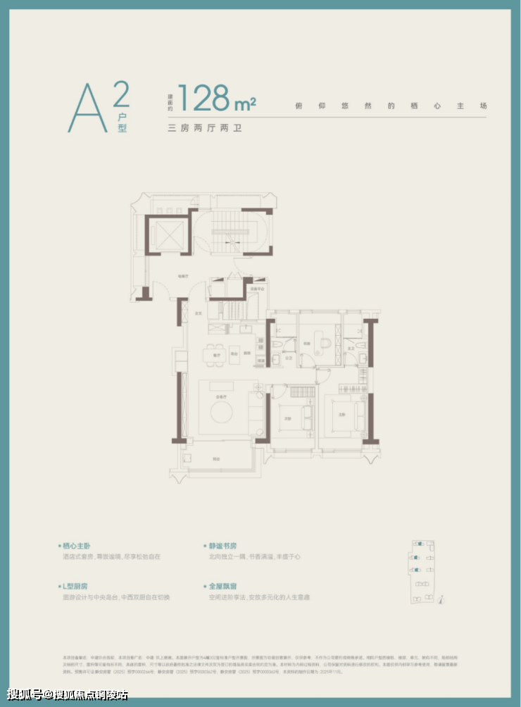 建面约 128㎡三房两厅两卫,是项目的入门改善户型,专为三口之家或年轻改善客群打造。户型三开间朝南,南向面宽约 10 米,采光面充足,阳光洒满全屋;南北通透,空气对流顺畅,室内清新干爽;全明格局,每一个空间都有窗户,无暗室死角。