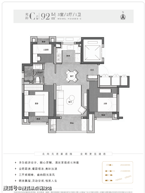 另外这个户型能更好实现南北通透,客厅-餐厅-阳台-厨房一线连通。